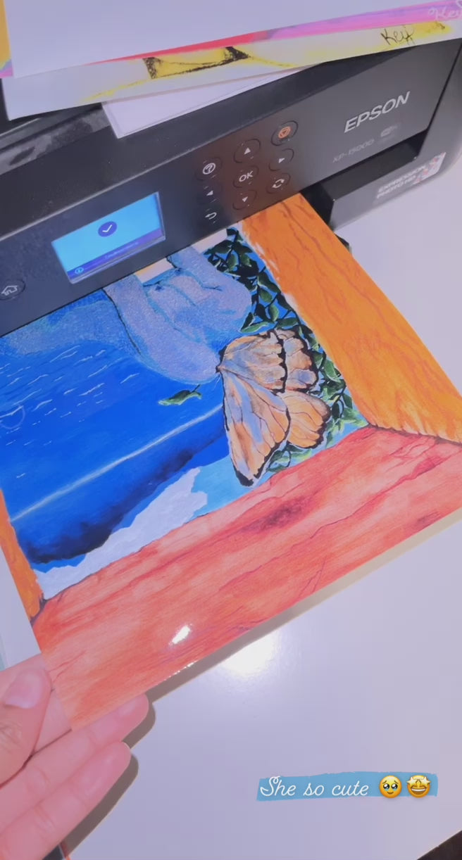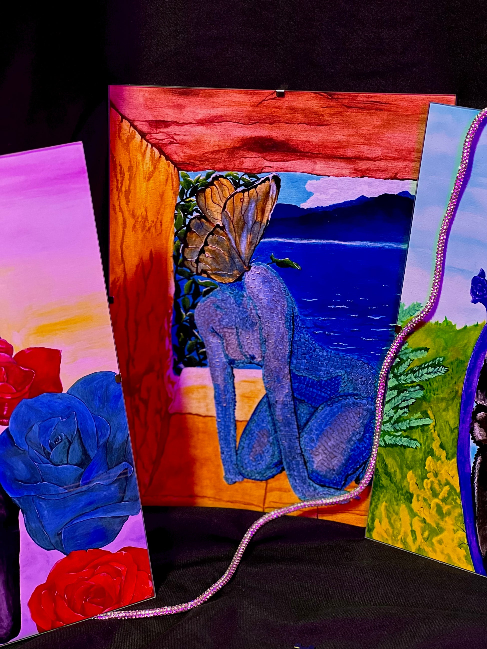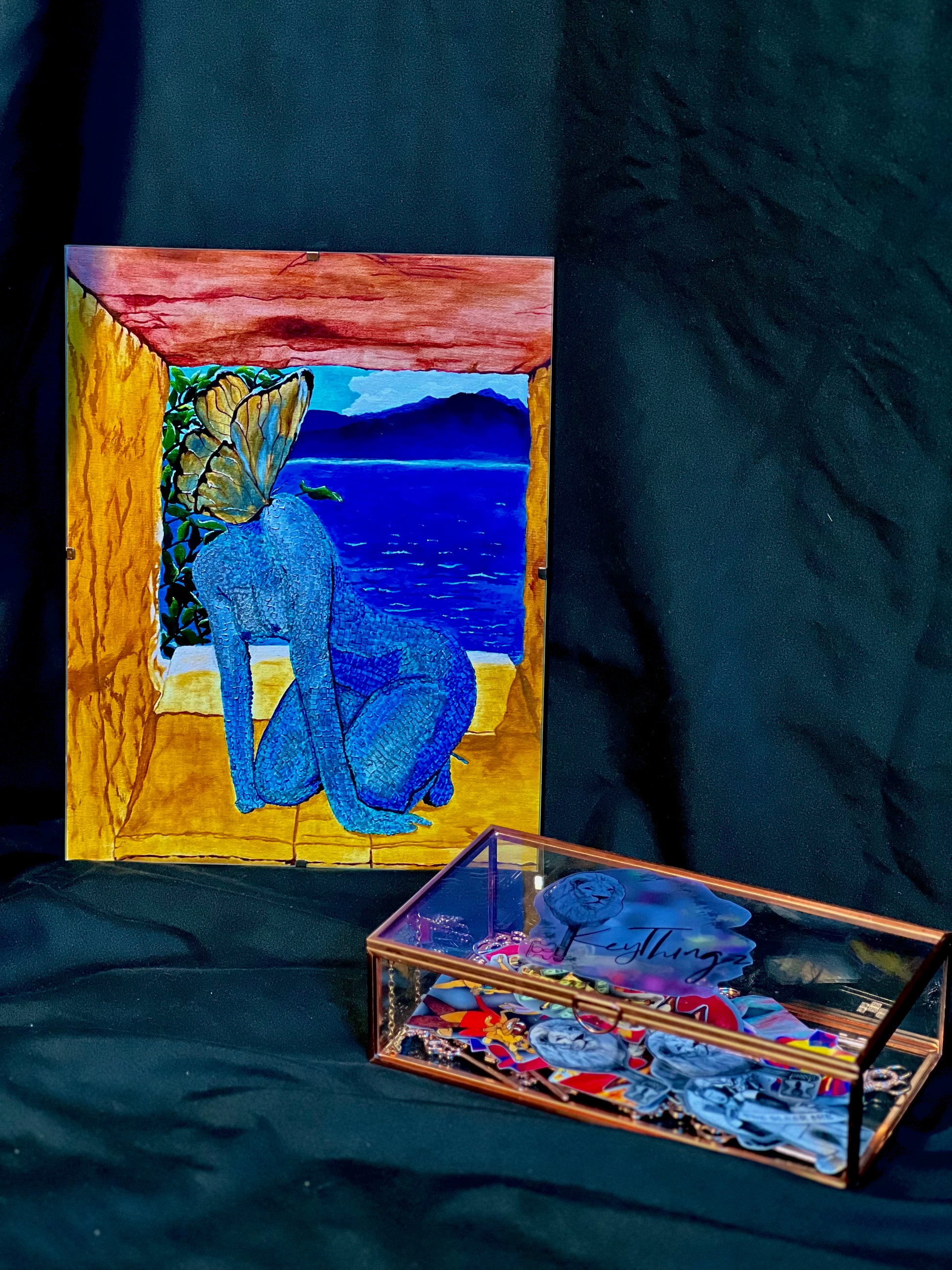 The rich, vibrant colors and intricate details of the figure’s mosaic-like skin, along with the delicate, translucent wings of the butterfly, make this piece a striking addition to any space. This print is perfect for those who appreciate surrealism, symbolism, and the beauty of nature’s mysteries.