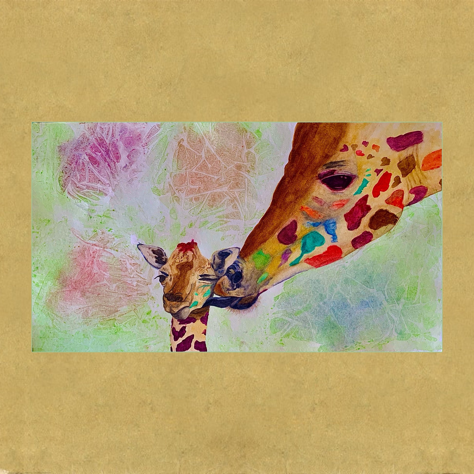 A vibrant tribute to the emotional journey of motherhood. “Motherly Kisses” captures the unconditional love between a giraffe and her calf, with colorful patches symbolizing the many feelings a mother carries—and passes on. Perfect for spaces that honor strength, love, and connection.